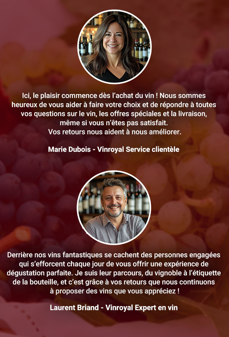Après chaque achat, nous apprécions avoir votre avis, car il nous aide à améliorer notre offre de manière ciblée. Si, malgré tout le soin apporté, un vin ne vous satisfait pas, nous vous remboursons le prix d’achat sans condition. Écrivez-nous simplement à info@vinroyal.fr, appelez-nous au +33 800 90 04 64 ou utilisez notre chat en ligne (du lundi au vendredi, de 10 h à 16 h).